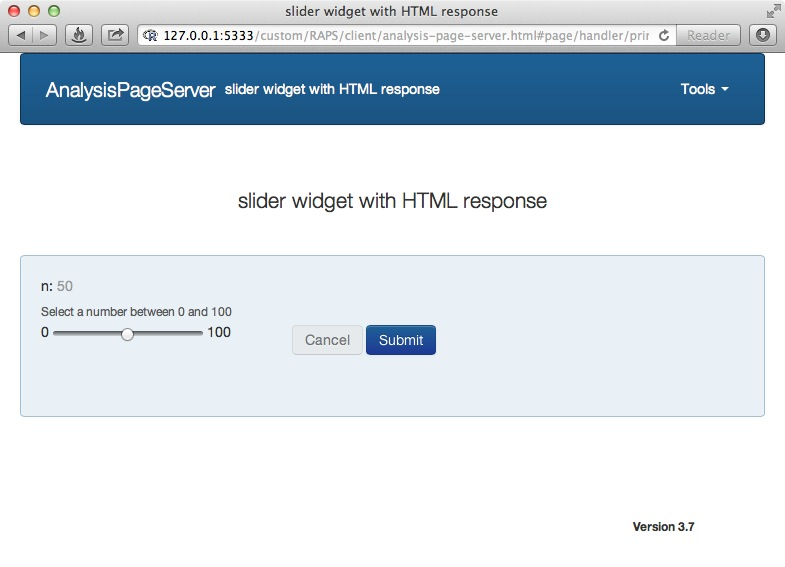 page <- new.analysis.page(handler, param.set = pset, name = "sine", label = "Sine Plotter")