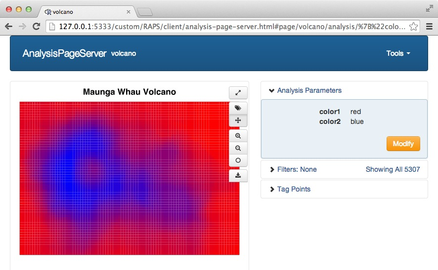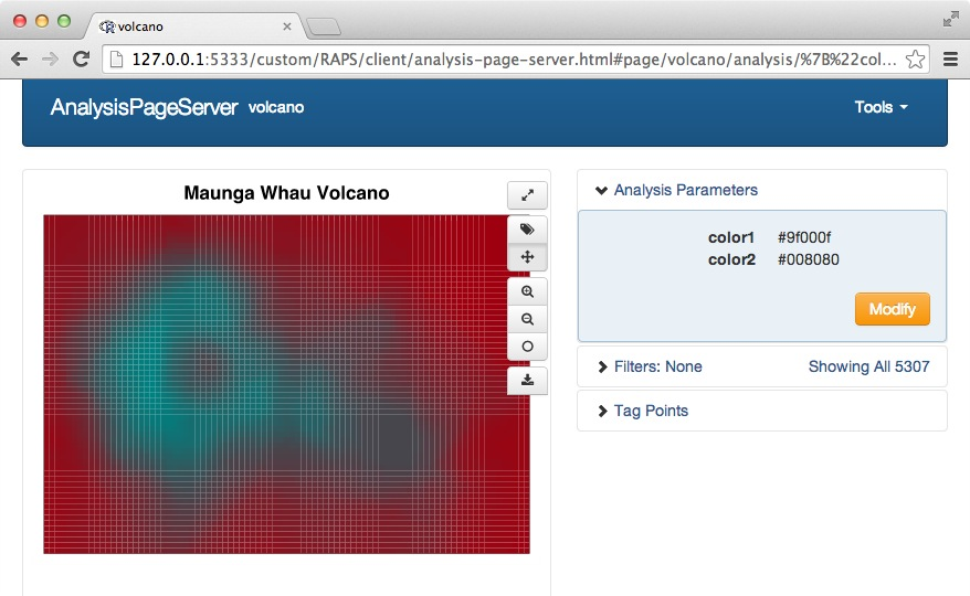 The interactivites discussed on the Interactivity documentation page, including roll-over, filtering, zooming, tagging and download, are all available with this deployment. Since they are described in detail there no more will be said about them here. What's new is the "Analysis Parameters" section, which is a condensed version of the primary parmeter area and lets the user see the inputs to the function. This section can also be used to repeat the analysis with modified parameters. First, click on Modify: