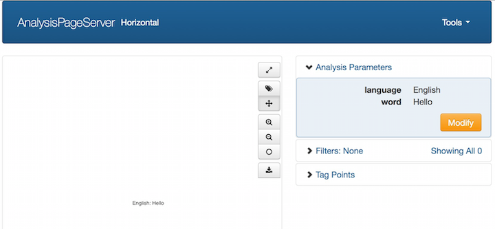The interactivites discussed on the Interactivity documentation page, including roll-over, filtering, zooming, tagging and download, are all available with this deployment. Since they are described in detail there no more will be said about them here. What's new is the "Analysis Parameters" section, which is a condensed version of the primary parmeter area and lets the user see the inputs to the function. This section can also be used to repeat the analysis with modified parameters. First, click on Modify: