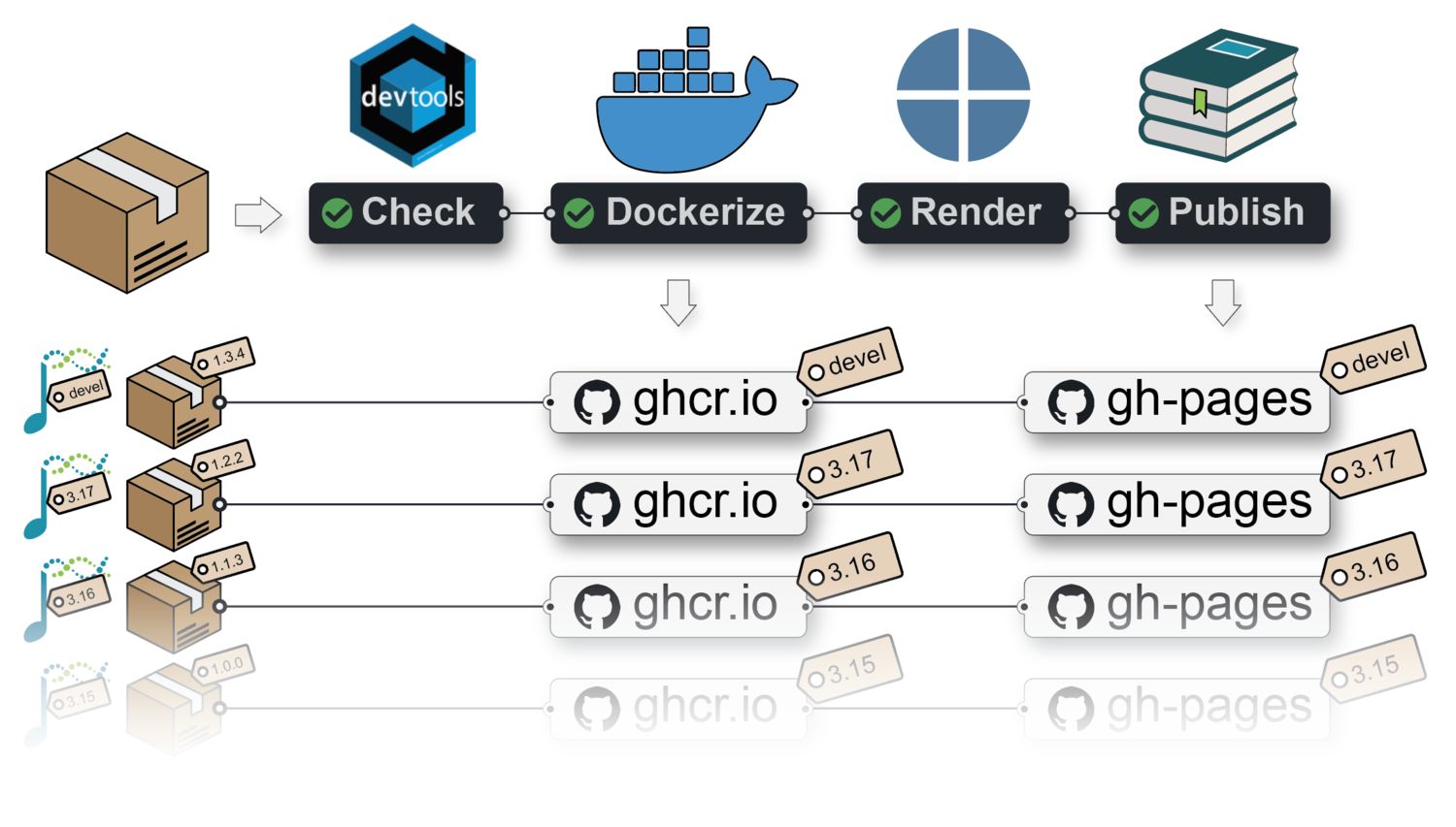 BiocBook}-based package without leaving R;pages/*.qmd files using enhanced markdown;BiocBook}-based package to Bioconductor.The containerization and publishing of the new {BiocBook}-based package is automated: