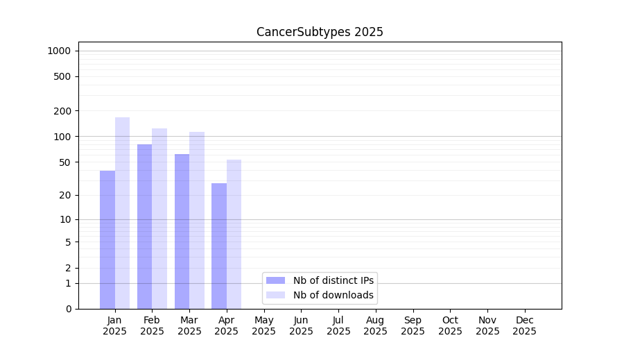 Number of downloads for software package CancerSubtypes, year by year, from 2025 back to 2014 (years with no downloads are omitted):