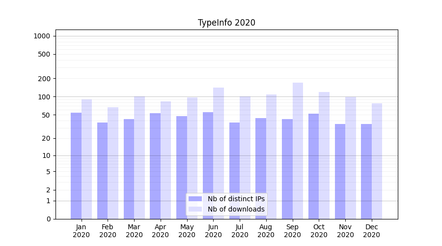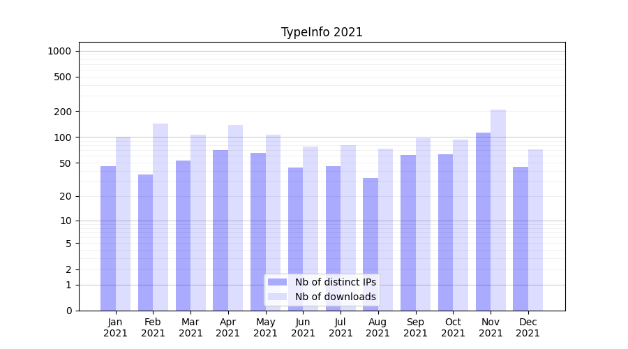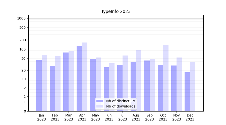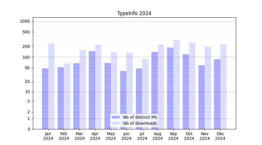 Number of downloads for software package TypeInfo, year by year, from 2025 back to 2014 (years with no downloads are omitted):
