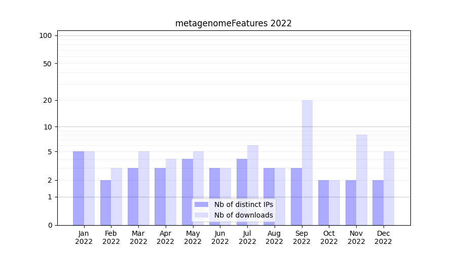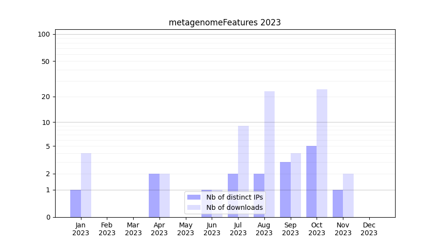 Number of downloads for software package metagenomeFeatures, year by year, from 2025 back to 2014 (years with no downloads are omitted):