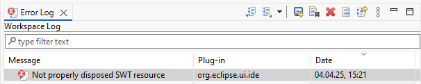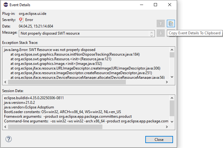 ``` eclipse.buildId=4.35.0.20250306-0811 java.version=21.0.2 java.vendor=Eclipse Adoptium BootLoader constants: OS=win32, ARCH=x86_64, WS=win32, NL=en_US Framework arguments: -product org.eclipse.epp.package.committers.product Command-line arguments: -os win32 -ws win32 -arch x86_64 -product org.eclipse.epp.package.committers.product org.eclipse.ui.ide Error Fri Apr 04 15:21:14 CEST 2025 Not properly disposed SWT resource java.lang.Error: SWT Resource was not properly disposed at org.eclipse.swt.graphics.Resource.initNonDisposeTracking(Resource.java:184) at org.eclipse.swt.graphics.Resource.(Resource.java:121) at org.eclipse.swt.graphics.Image. (Image.java:552) at org.eclipse.jface.resource.URLImageDescriptor.createImage(URLImageDescriptor.java:306) ... ```