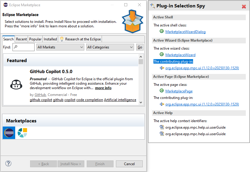Here we have used Help → Eclipse Marketplace to bring up Marketplace dialog and used the Plug-in Selection Spy key combination to bring up the spy dialog: