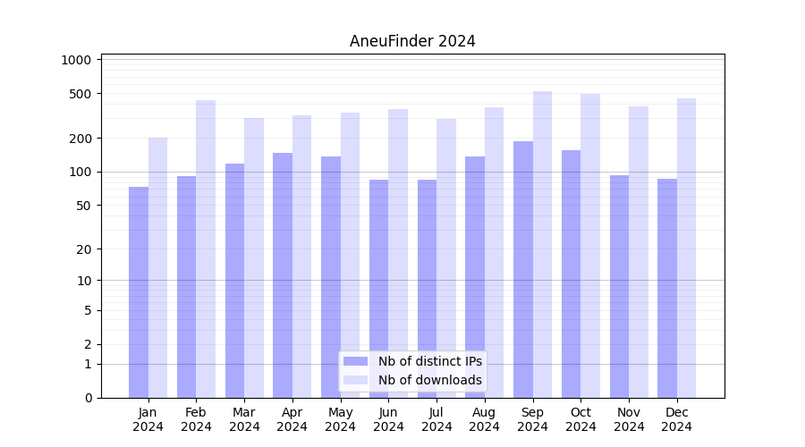 Number of downloads for software package AneuFinder, year by year, from 2025 back to 2014 (years with no downloads are omitted):