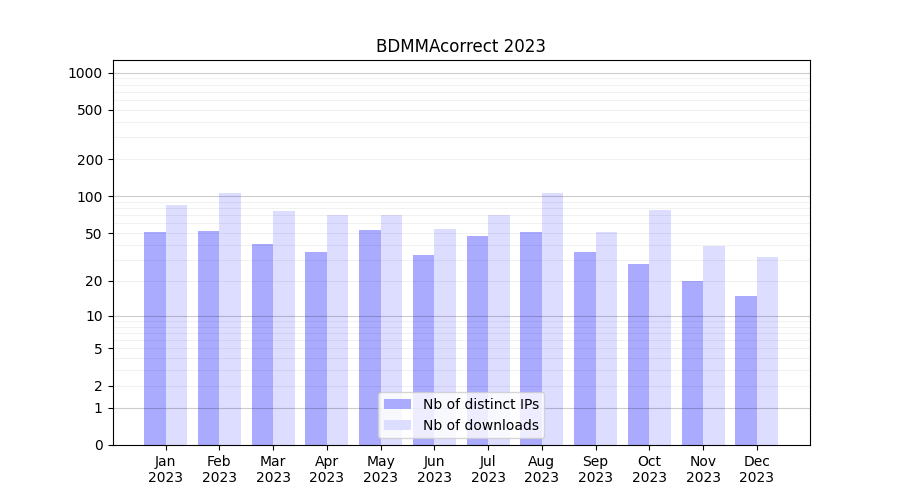 Number of downloads for software package BDMMAcorrect, year by year, from 2025 back to 2014 (years with no downloads are omitted):