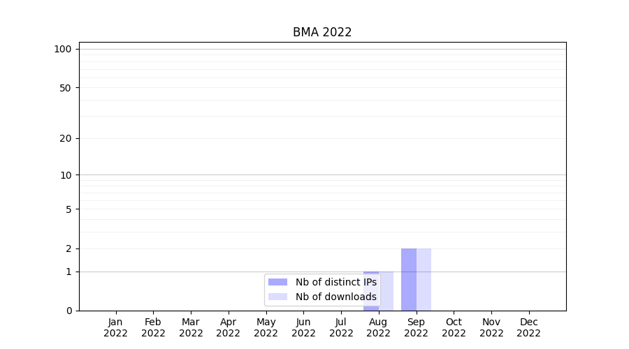 Number of downloads for software package BMA, year by year, from 2025 back to 2014 (years with no downloads are omitted):