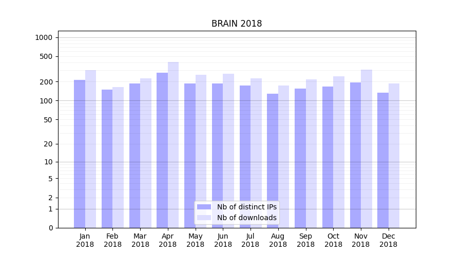 Number of downloads for software package BRAIN, year by year, from 2025 back to 2014 (years with no downloads are omitted):