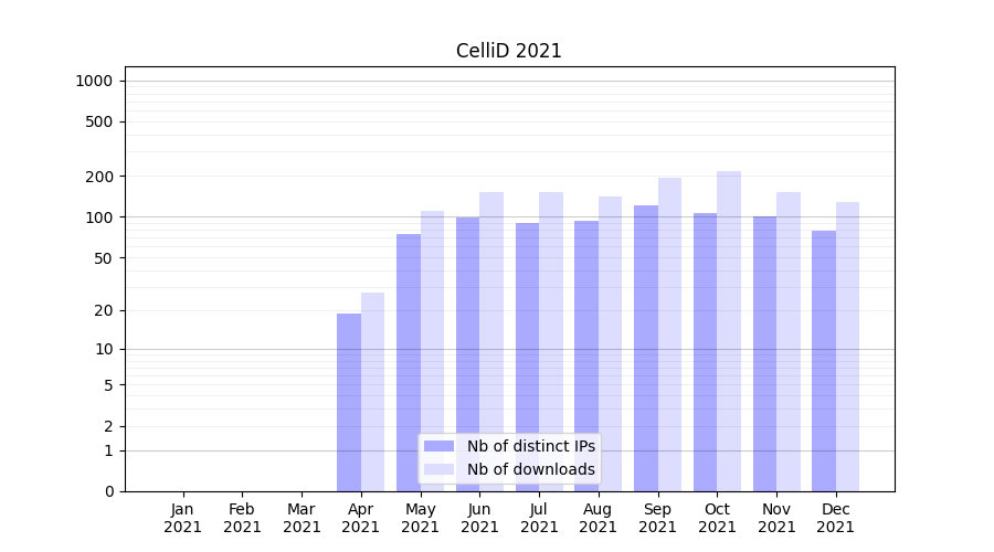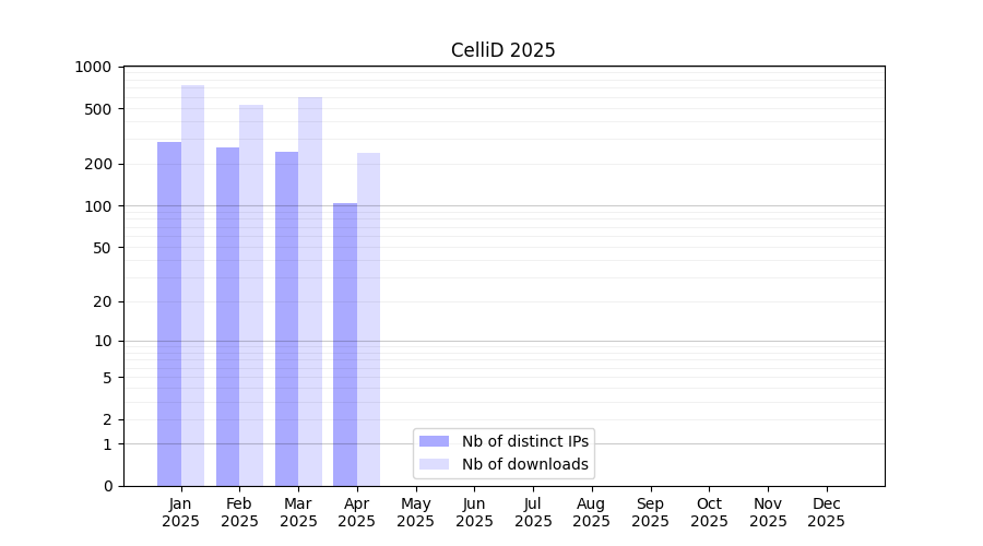 Number of downloads for software package CelliD, year by year, from 2025 back to 2014 (years with no downloads are omitted):