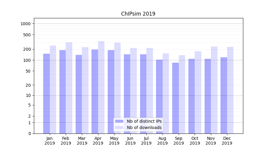Number of downloads for software package ChIPsim, year by year, from 2025 back to 2014 (years with no downloads are omitted):