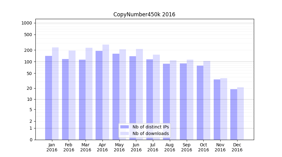 Number of downloads for software package CopyNumber450k, year by year, from 2025 back to 2014 (years with no downloads are omitted):