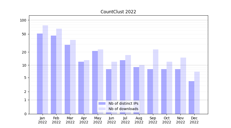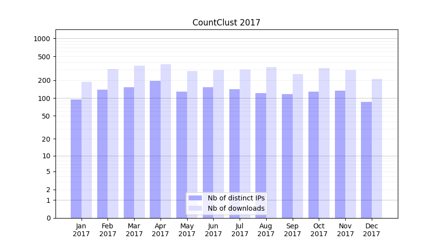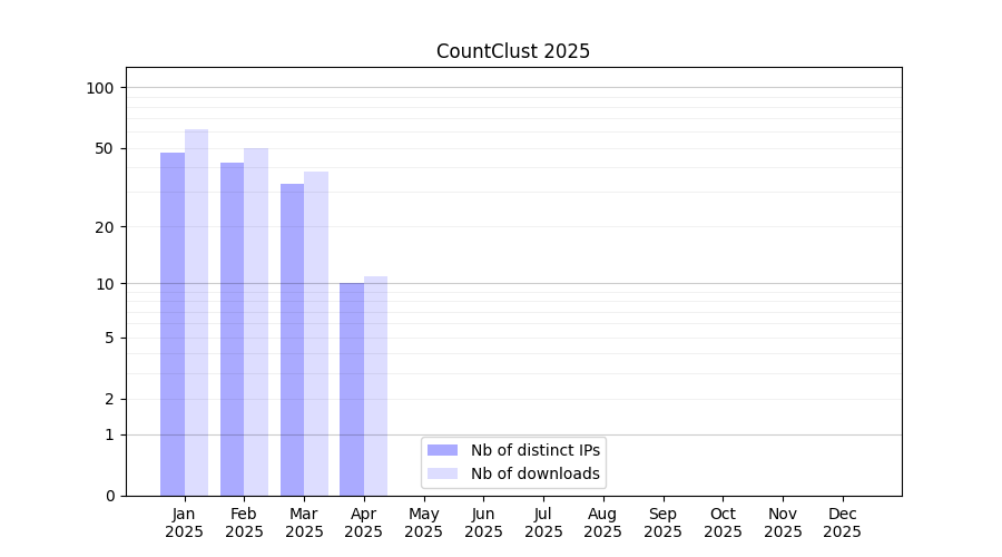 Number of downloads for software package CountClust, year by year, from 2025 back to 2014 (years with no downloads are omitted):