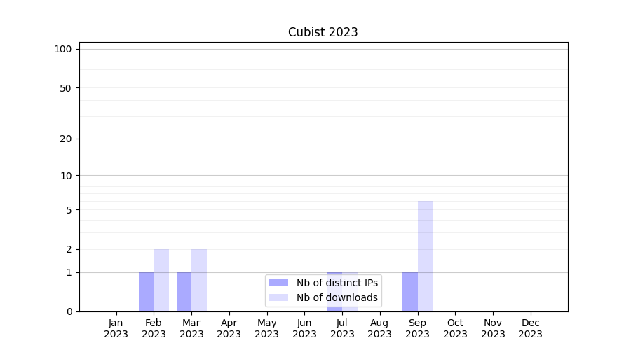 Number of downloads for software package Cubist, year by year, from 2025 back to 2014 (years with no downloads are omitted):