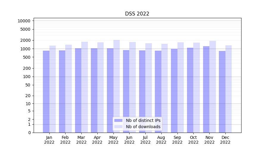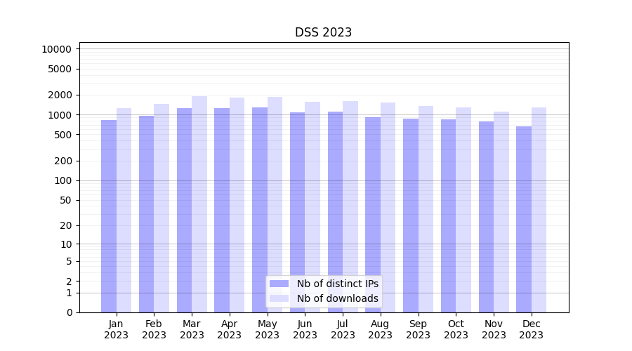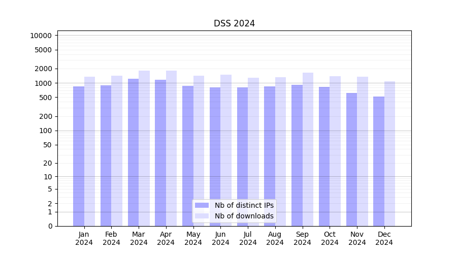 Number of downloads for software package DSS, year by year, from 2025 back to 2014 (years with no downloads are omitted):