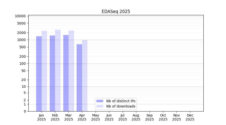 Number of downloads for software package EDASeq, year by year, from 2025 back to 2014 (years with no downloads are omitted):