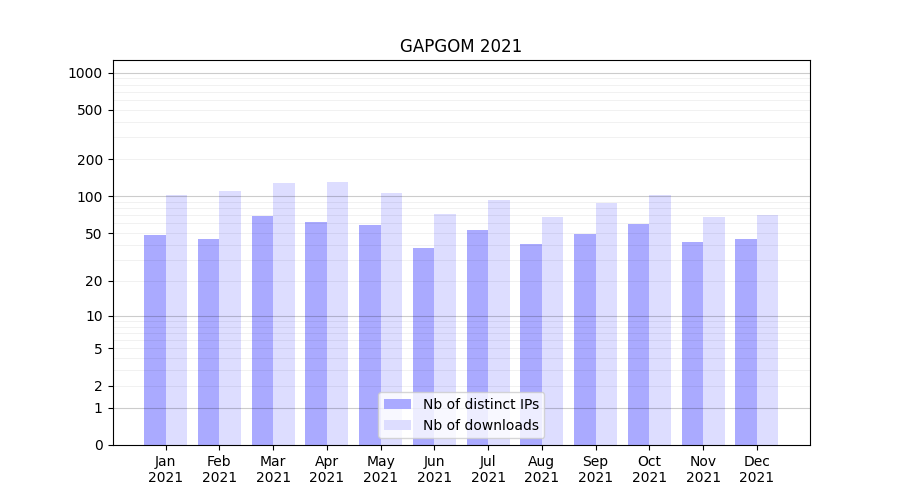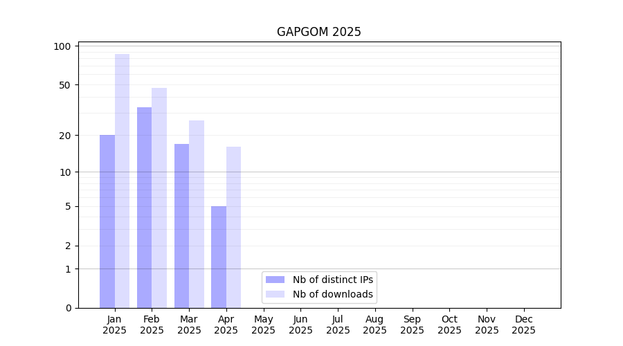 Number of downloads for software package GAPGOM, year by year, from 2025 back to 2014 (years with no downloads are omitted):