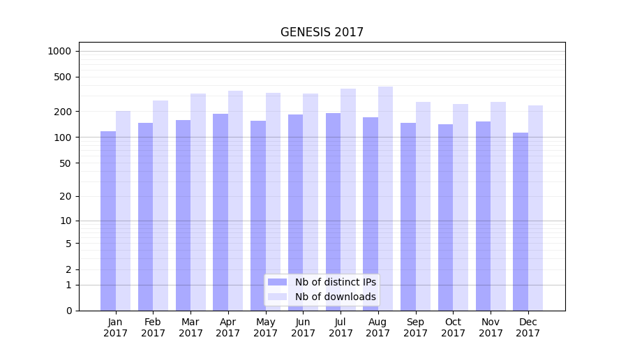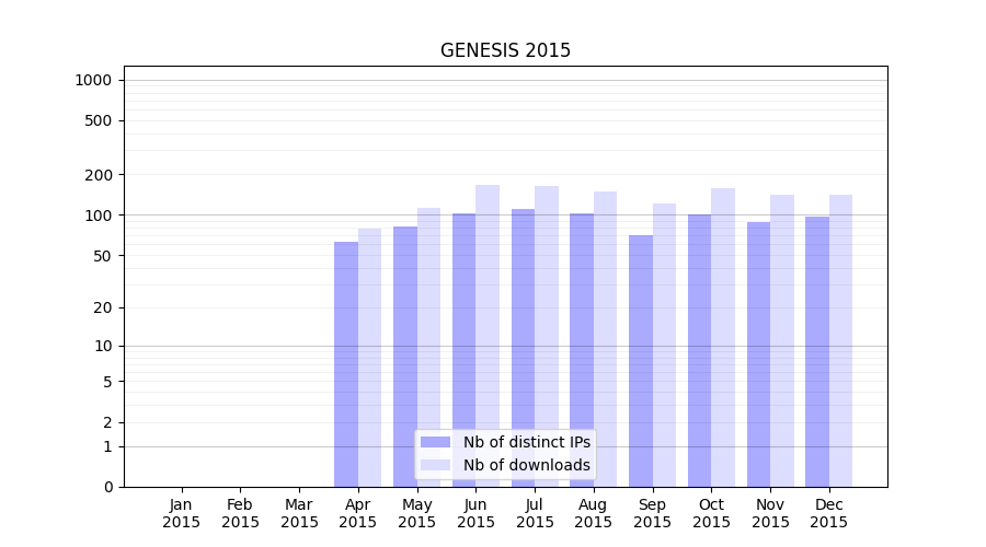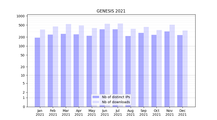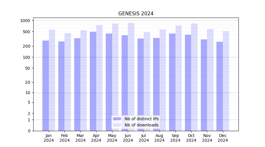 Number of downloads for software package GENESIS, year by year, from 2025 back to 2014 (years with no downloads are omitted):