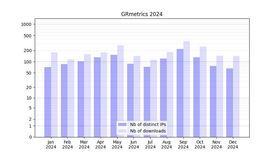 Number of downloads for software package GRmetrics, year by year, from 2025 back to 2014 (years with no downloads are omitted):