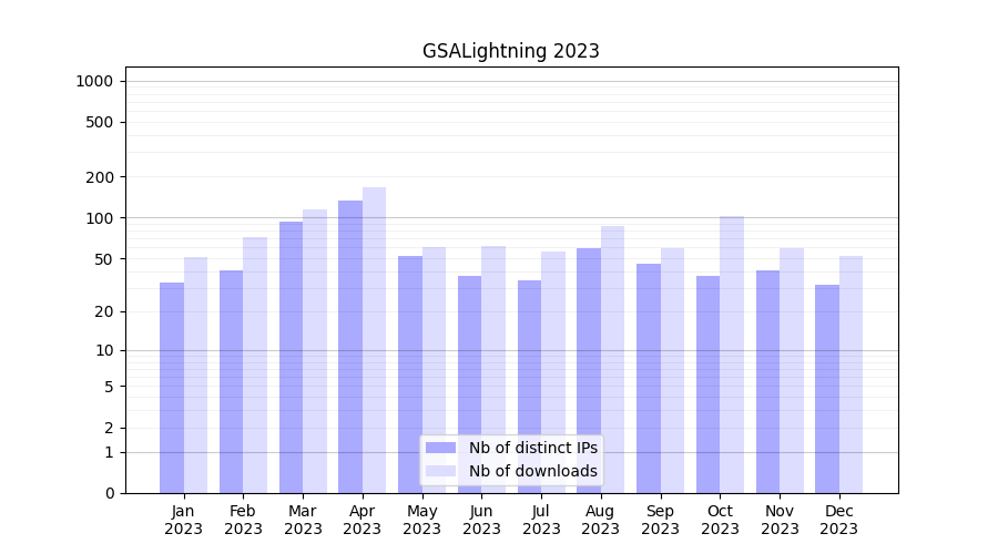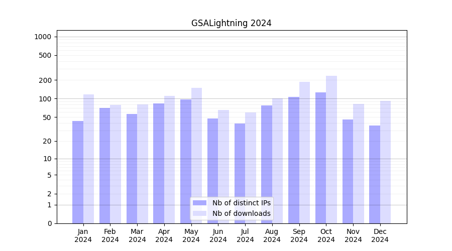 Number of downloads for software package GSALightning, year by year, from 2025 back to 2014 (years with no downloads are omitted):