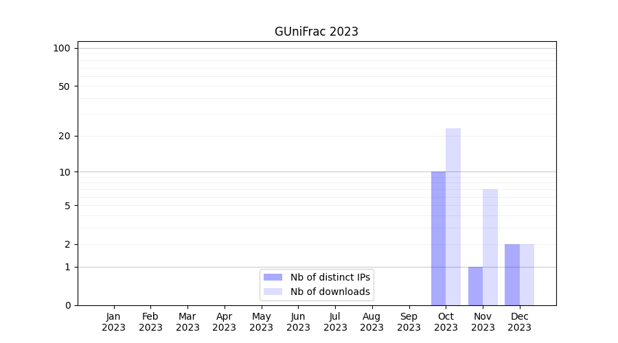 Number of downloads for software package GUniFrac, year by year, from 2025 back to 2014 (years with no downloads are omitted):