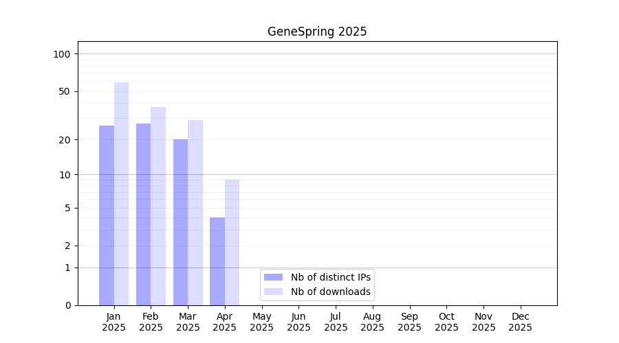 Number of downloads for software package GeneSpring, year by year, from 2025 back to 2014 (years with no downloads are omitted):