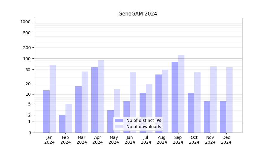 Number of downloads for software package GenoGAM, year by year, from 2025 back to 2014 (years with no downloads are omitted):