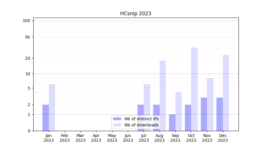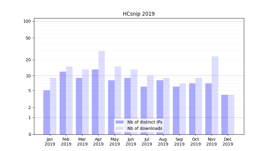 Number of downloads for software package HCsnip, year by year, from 2025 back to 2014 (years with no downloads are omitted):