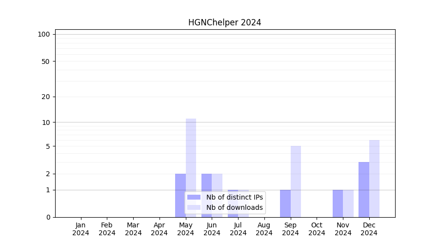 Number of downloads for software package HGNChelper, year by year, from 2025 back to 2014 (years with no downloads are omitted):