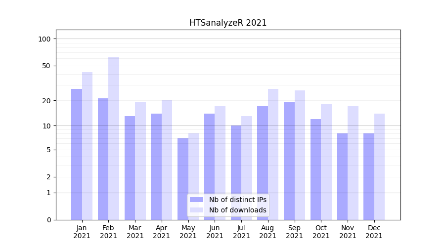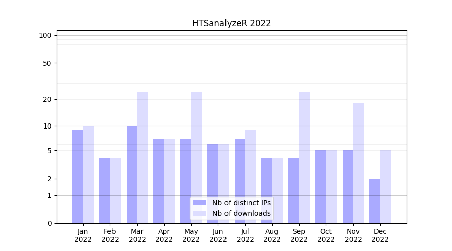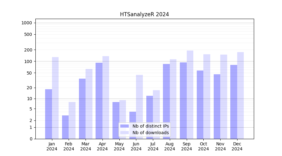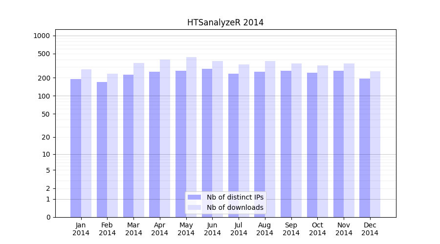 Number of downloads for software package HTSanalyzeR, year by year, from 2025 back to 2014 (years with no downloads are omitted):