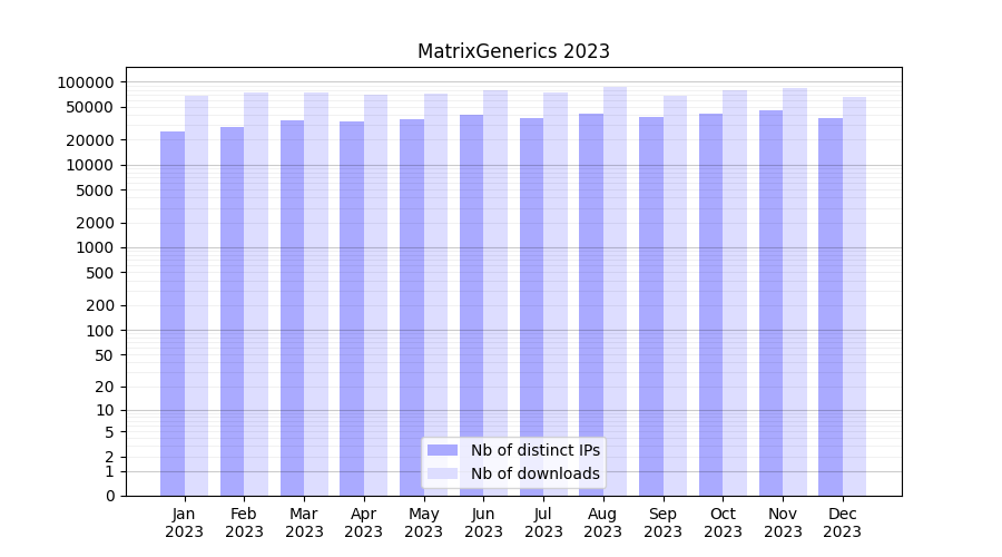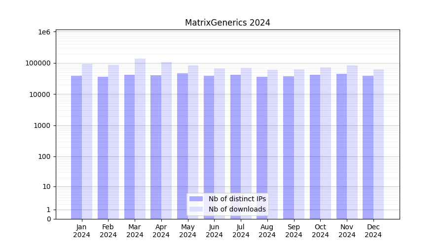 Number of downloads for software package MatrixGenerics, year by year, from 2025 back to 2014 (years with no downloads are omitted):