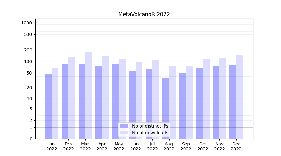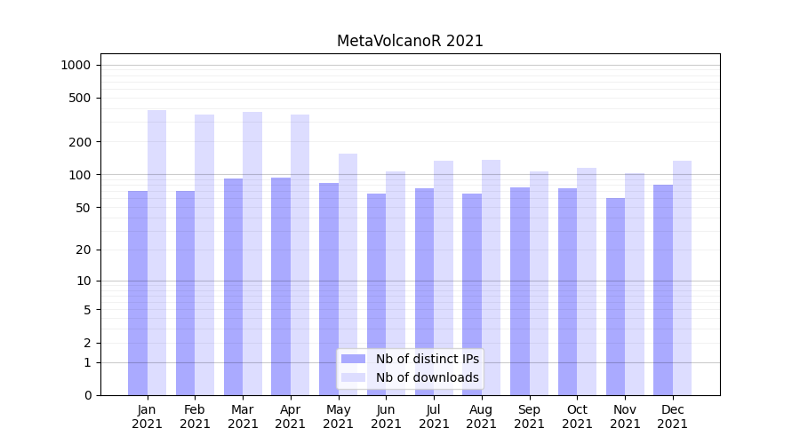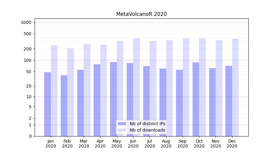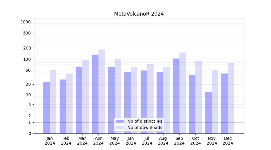 Number of downloads for software package MetaVolcanoR, year by year, from 2025 back to 2014 (years with no downloads are omitted):