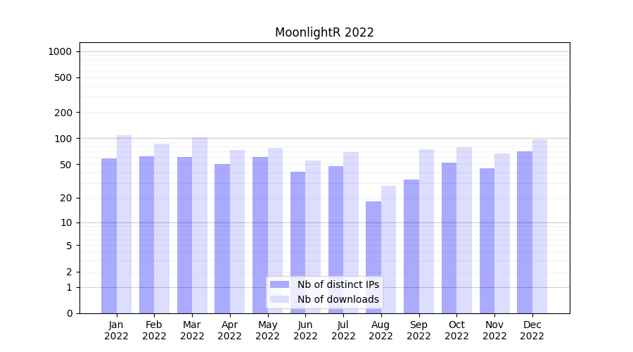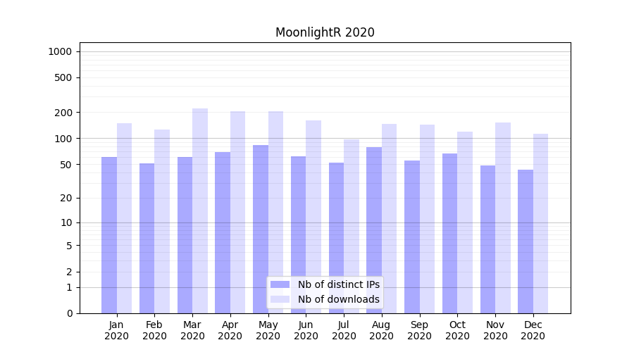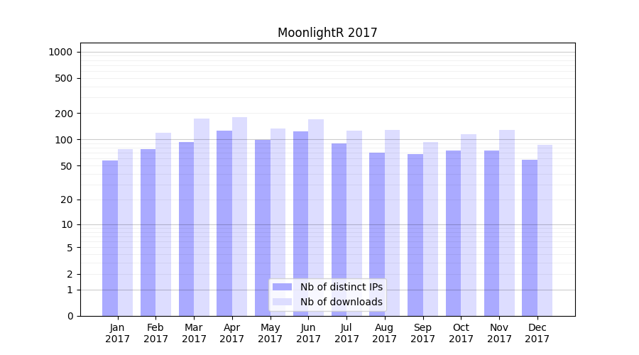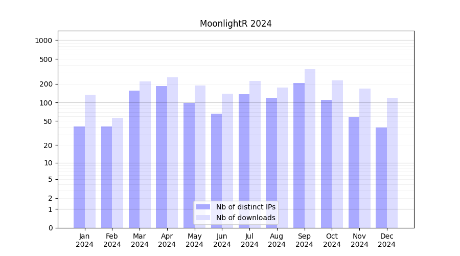 Number of downloads for software package MoonlightR, year by year, from 2025 back to 2014 (years with no downloads are omitted):