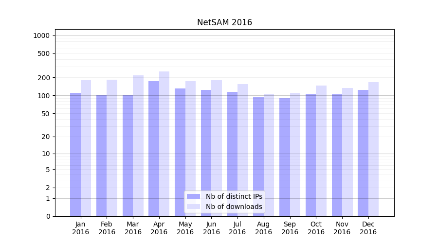 Number of downloads for software package NetSAM, year by year, from 2025 back to 2014 (years with no downloads are omitted):
