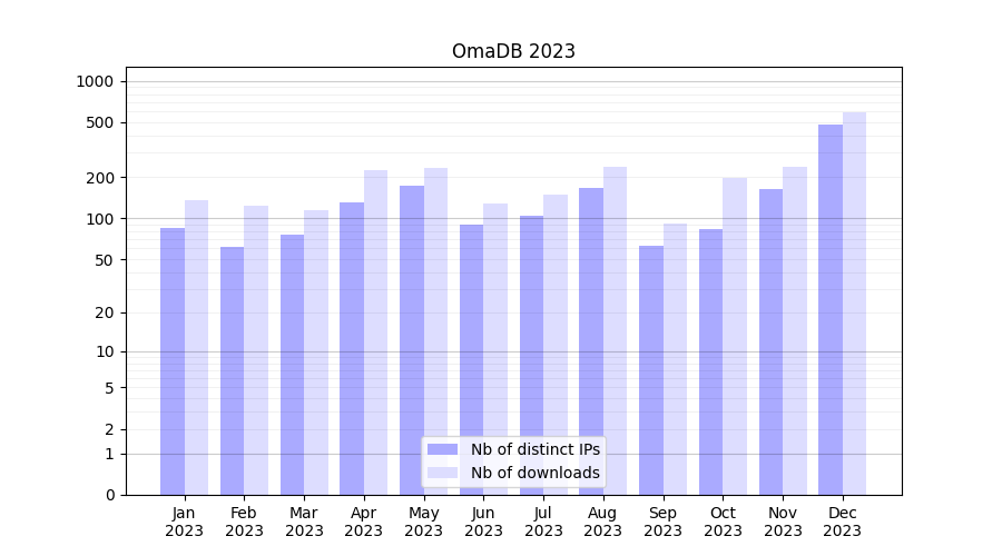 Number of downloads for software package OmaDB, year by year, from 2025 back to 2014 (years with no downloads are omitted):