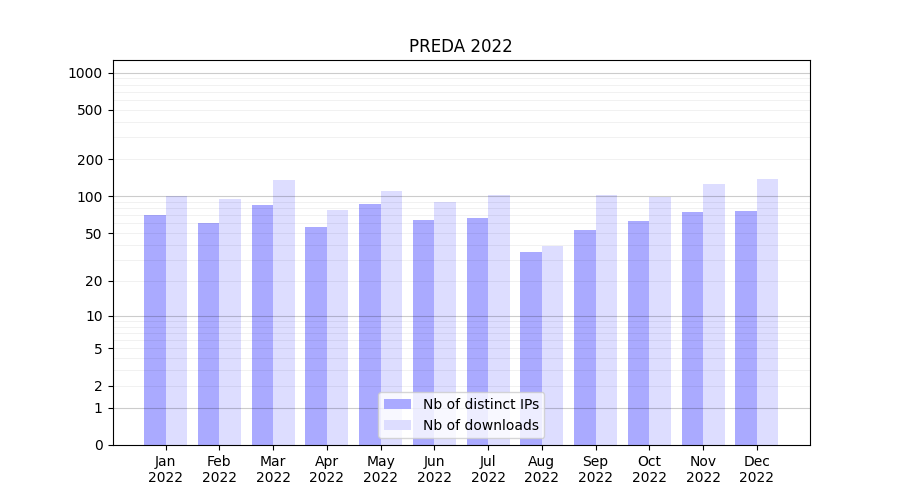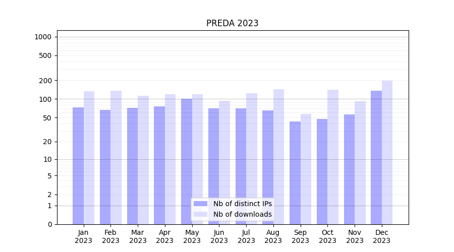 Number of downloads for software package PREDA, year by year, from 2025 back to 2014 (years with no downloads are omitted):