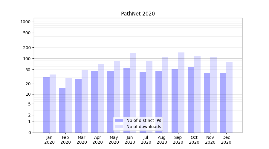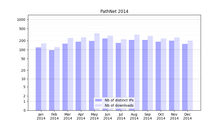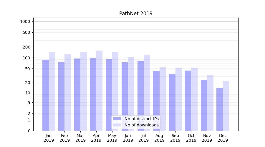 Number of downloads for software package PathNet, year by year, from 2025 back to 2014 (years with no downloads are omitted):