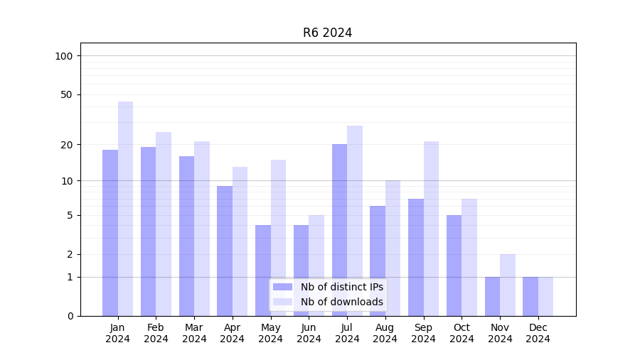Number of downloads for software package R6, year by year, from 2025 back to 2014 (years with no downloads are omitted):