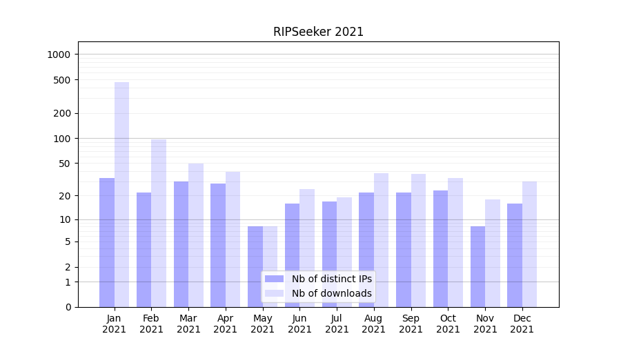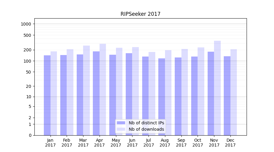 Number of downloads for software package RIPSeeker, year by year, from 2025 back to 2014 (years with no downloads are omitted):