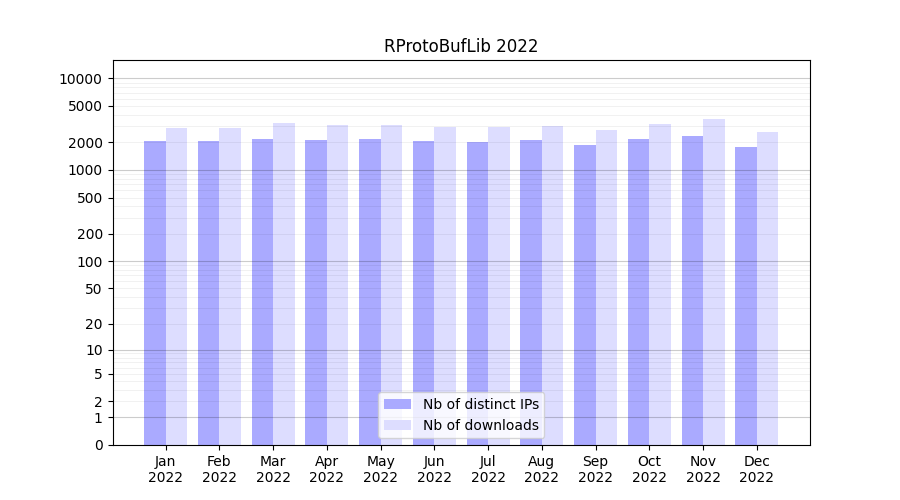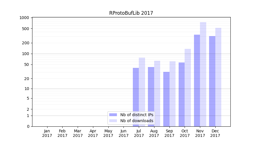 Number of downloads for software package RProtoBufLib, year by year, from 2025 back to 2014 (years with no downloads are omitted):