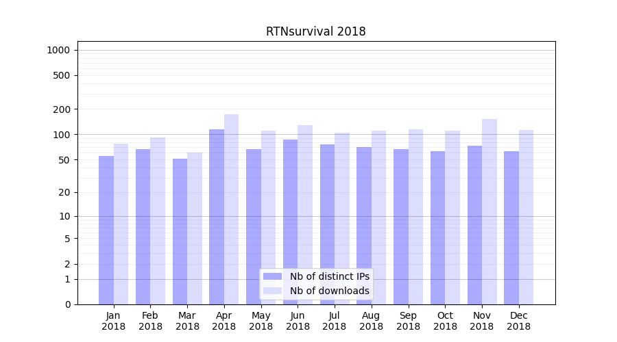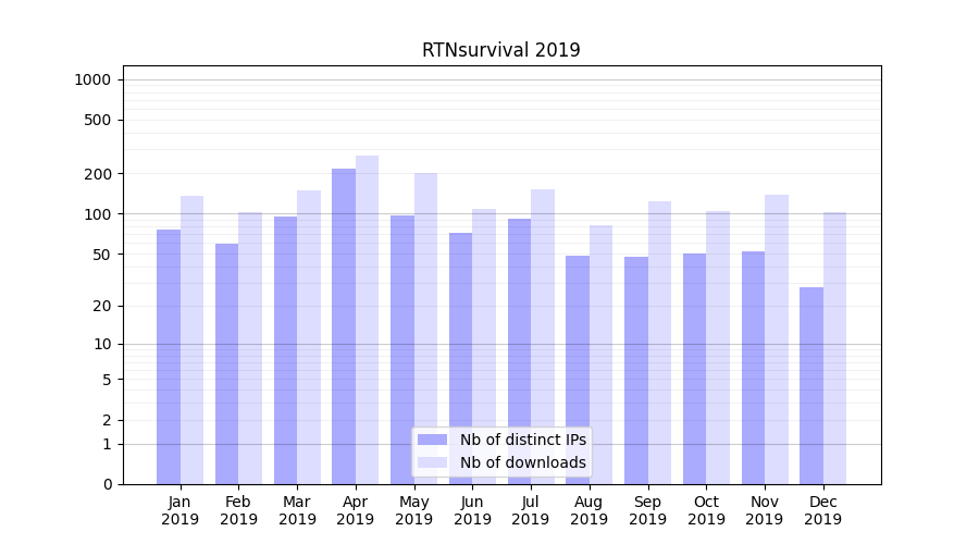 Number of downloads for software package RTNsurvival, year by year, from 2025 back to 2014 (years with no downloads are omitted):