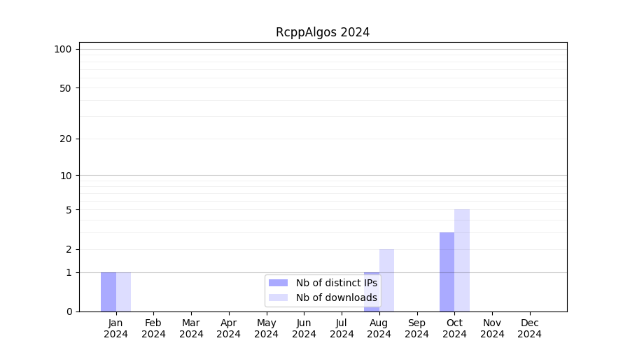 Number of downloads for software package RcppAlgos, year by year, from 2025 back to 2014 (years with no downloads are omitted):
