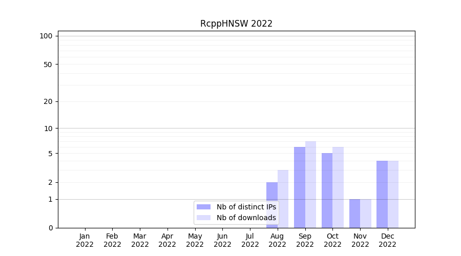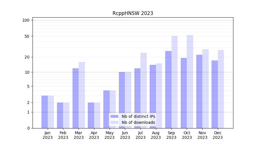 Number of downloads for software package RcppHNSW, year by year, from 2025 back to 2014 (years with no downloads are omitted):