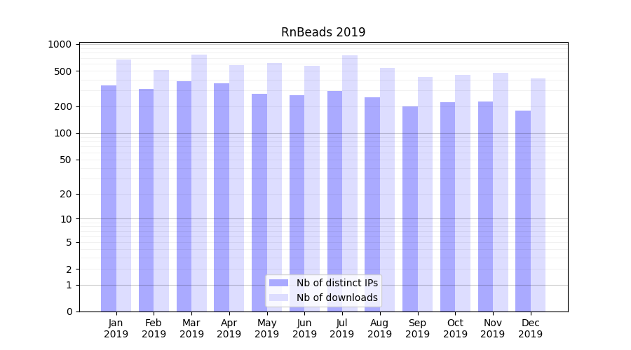 Number of downloads for software package RnBeads, year by year, from 2025 back to 2014 (years with no downloads are omitted):