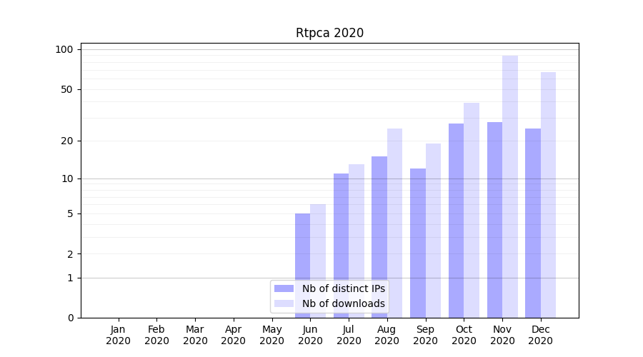 Number of downloads for software package Rtpca, year by year, from 2025 back to 2014 (years with no downloads are omitted):