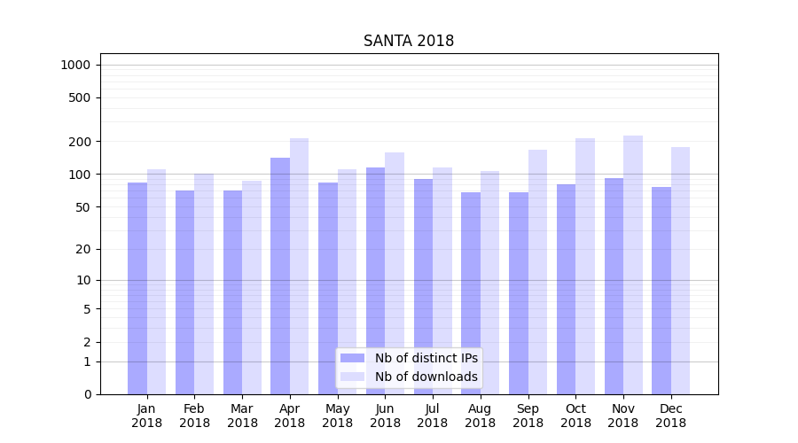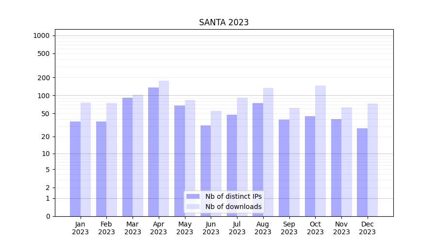 Number of downloads for software package SANTA, year by year, from 2025 back to 2014 (years with no downloads are omitted):