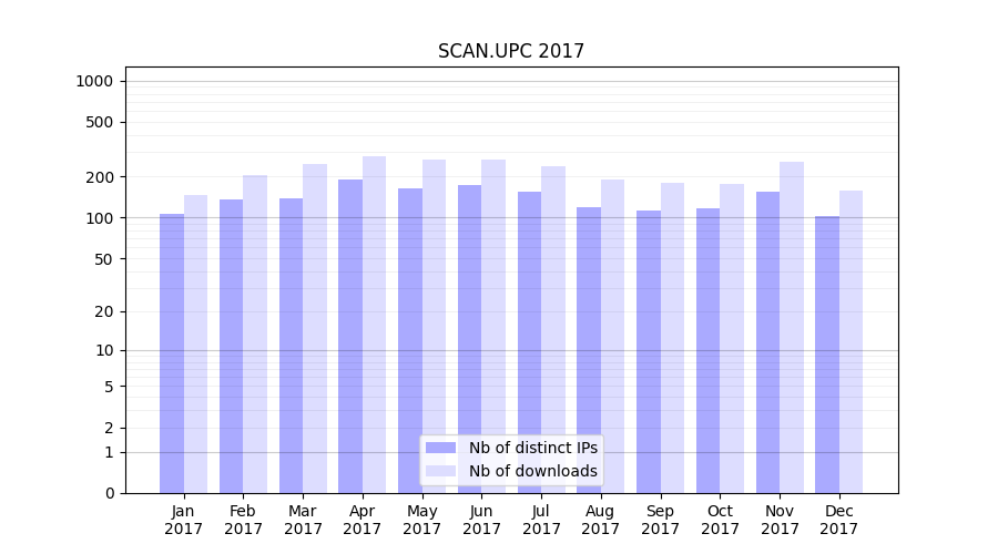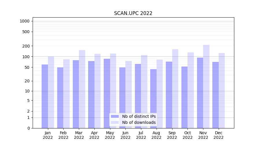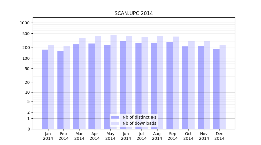 Number of downloads for software package SCAN.UPC, year by year, from 2025 back to 2014 (years with no downloads are omitted):
