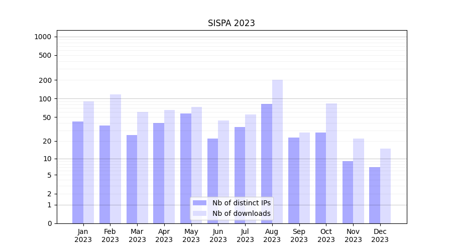 Number of downloads for software package SISPA, year by year, from 2025 back to 2014 (years with no downloads are omitted):