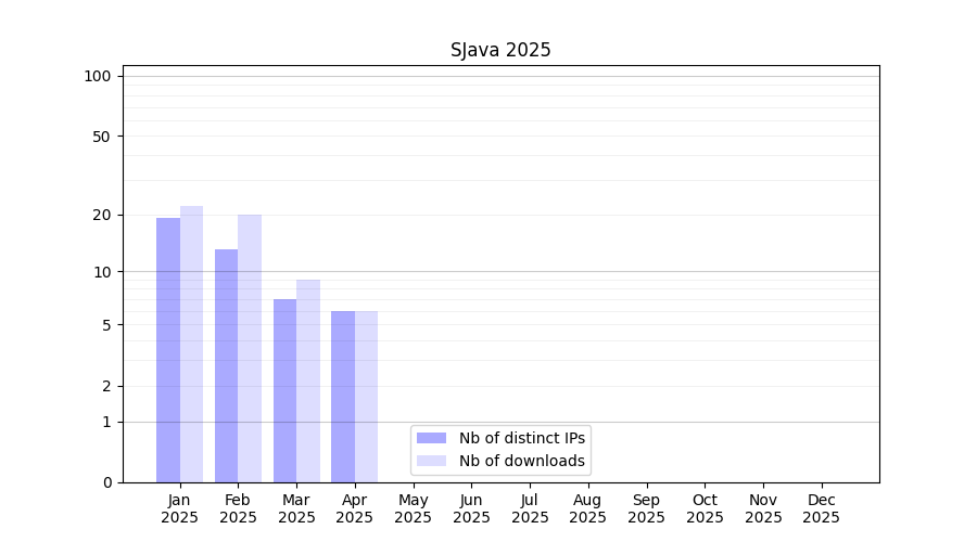 Number of downloads for software package SJava, year by year, from 2025 back to 2014 (years with no downloads are omitted):