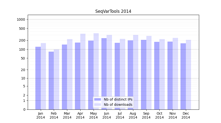 Number of downloads for software package SeqVarTools, year by year, from 2025 back to 2014 (years with no downloads are omitted):